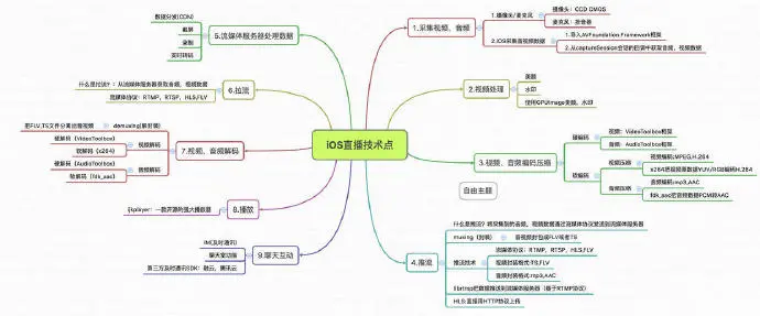 1.采集、2.滤镜处理、3.编码、4.推流、5.CDN分发、6.拉流、7.解码、8.播放、9.聊天互动