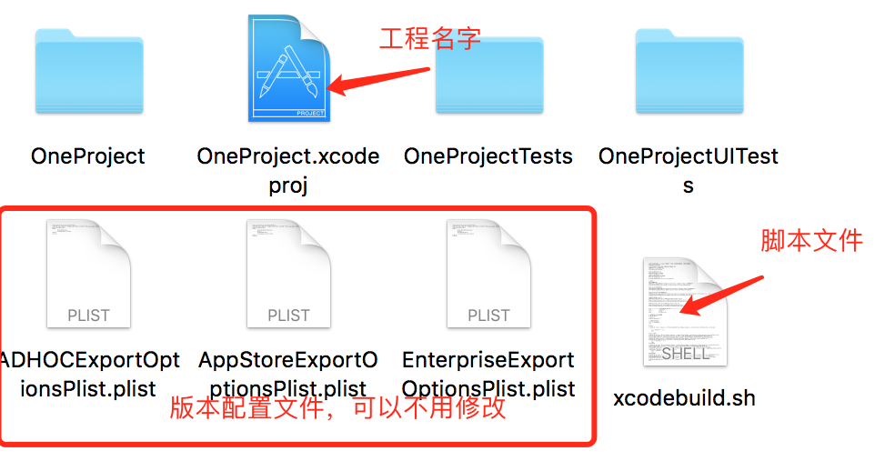 注意:1.由于脚本配置的路径问题,所以xcodebuild.sh和xxx.xcodeproj放到同一个目录下,否则会出现路径问题。如图所示: