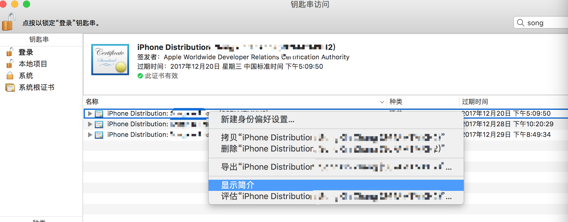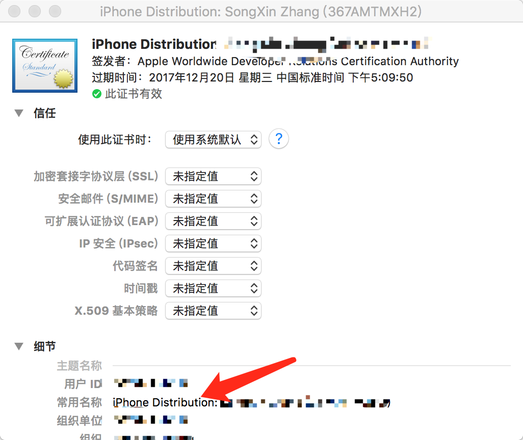 打开钥匙串访问,找到证书,点击显示简介,里面有个常用名字,复制到脚本中即可,如图所示: