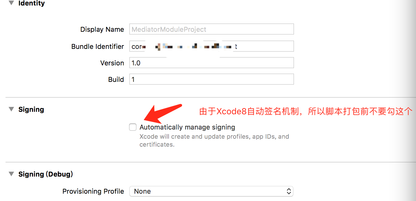 2.由于Xcode8可以在Project->General中自动配置证书,所以用脚本打包前先去掉该功能。如图所示: