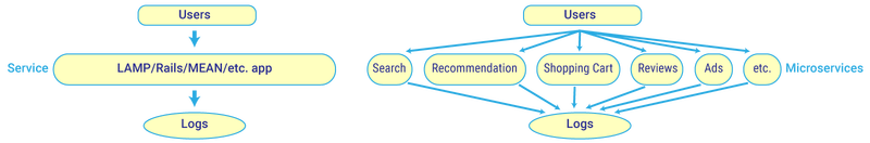 理论上,由单体架构产生的数据很容易追踪。按定义说,系统是中心化的,它生成的日志都可以使用相同的模式格式化。微服务,就我们所知道,不是这样的。不同服务的日志有自己的模式,或者根本就没有模式可言!因此,简单地从不同的服务收集日志,再将它们转成可读的格式,是一个难以解决的数据基础架构问题。