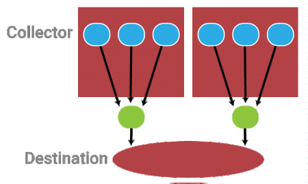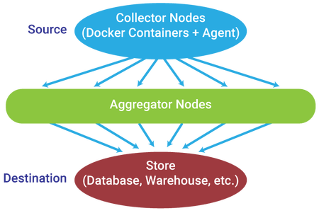 在容器里运行的收集器节点代理,将结构化的数据实时的(或者微批量的)转发到聚合器节点。聚合器节点的工作是将多个小的日志流组合成一个数据流,更容易处理和收集到 Store 节点,在那里它们将被持久化以备日后使用。