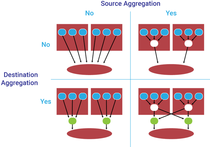 最佳的配置是同时在来源端和目标端设置聚合器,同样,我们要权衡利弊,这样会导致有更多的节点,比之前的配置稍复杂。但是好处是显而易见的: