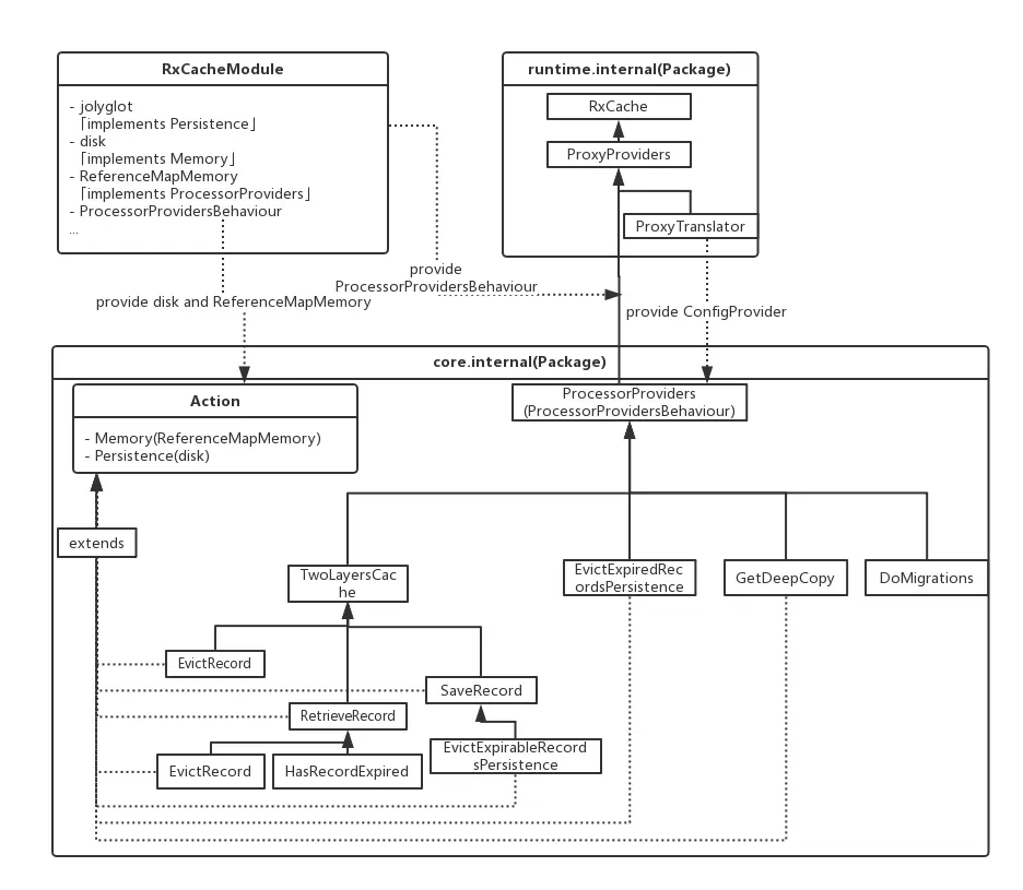 RxCache使用注解来为Retrofit配置缓存信息,内部使用动态代理和Dagger来实现,这个库的资料相对较少,官方教程又是全英文的,这无疑给开发者增加了使用难度,其实我英文也不好,但是源码是通用的啊,所以我为大家从源码的角度来讲解此库,此库源码的难点其实都在Dagger注入上,我先为大家讲解用法,后面会再写篇文章讲解源码,在学习Dagger的朋友除了建议看看我的MVPArms外,还可以看看这个RxCache的源码,能学到很多东西,先给张RxCache的架构图,让大家尝尝鲜,请期待我后面的源码分析