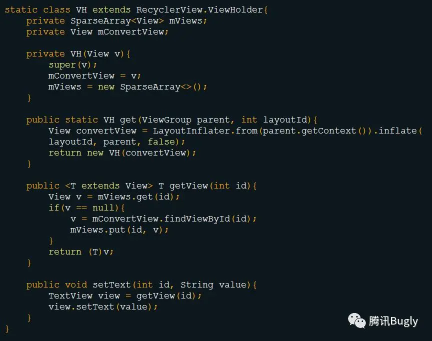 其中的关键点在于通过SparseArray<View>存储item view的控件,getView(int id)的功能就是通过id获得对应的View(首先在mViews中查询是否存在,如果没有,那么 findViewById()并放入mViews中,避免下次再执行findViewById())。