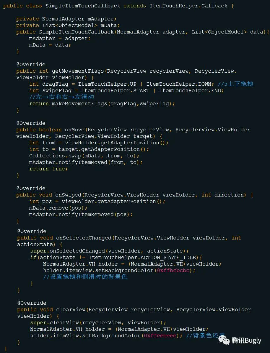 Android提供了ItemTouchHelper类,使得RecyclerView能够轻易地实现滑动和拖拽,此处我们要实现上下拖拽和侧滑删除。首先创建一个继承自 ItemTouchHelper.Callback的类,并重写以下方法: