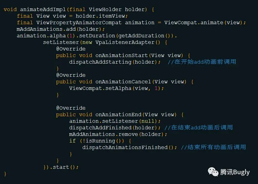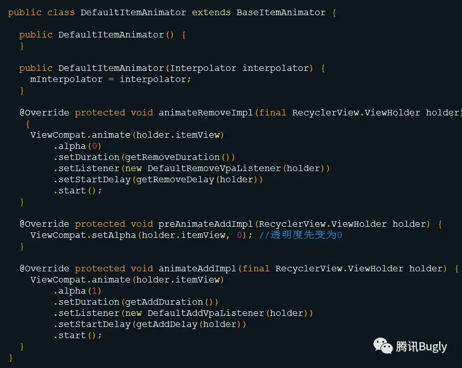 在runPendingAnimations()中, animateAddImpl()是执行add动画的具体方法,其实就是将itemView的透明度从0变到1(在 animateAdd()中已经将view的透明度变为0),实现如下:
