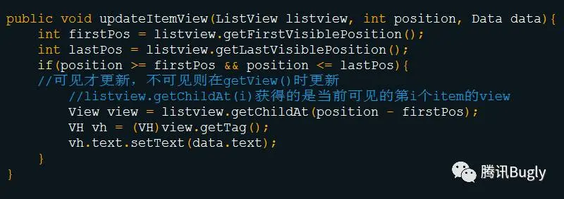 可以看出,我们通过ListView的getChildAt()来获得需要更新的View,然后通过 getTag()获得ViewHolder,从而实现更新。