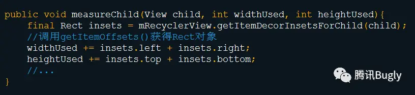 RecyclerView继承了ViewGroup,并重写了measureChild(),该方法在 onMeasure()中被调用,用来计算每个child的大小,计算每个child大小的时候就需要加上getItemOffsets()设置的外间距: