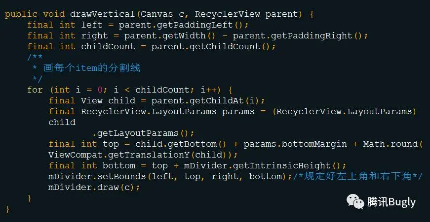 这里我们只考虑mOrientation == VERTICAL_LIST的情况,DividerItemDecoration的 onDraw()实际上调用了drawVertical():