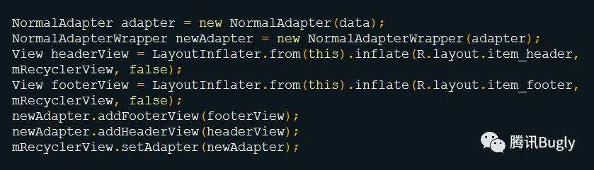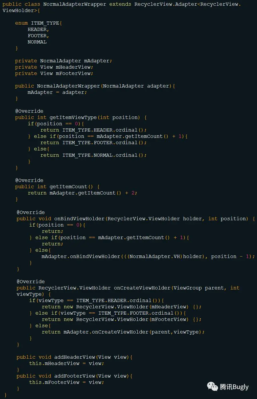 这恰恰满足了我们的需求。我们只需要通过以下方式为原有的Adapter(这里命名为NormalAdapter)添加 addHeaderView()和 addFooterView()接口: