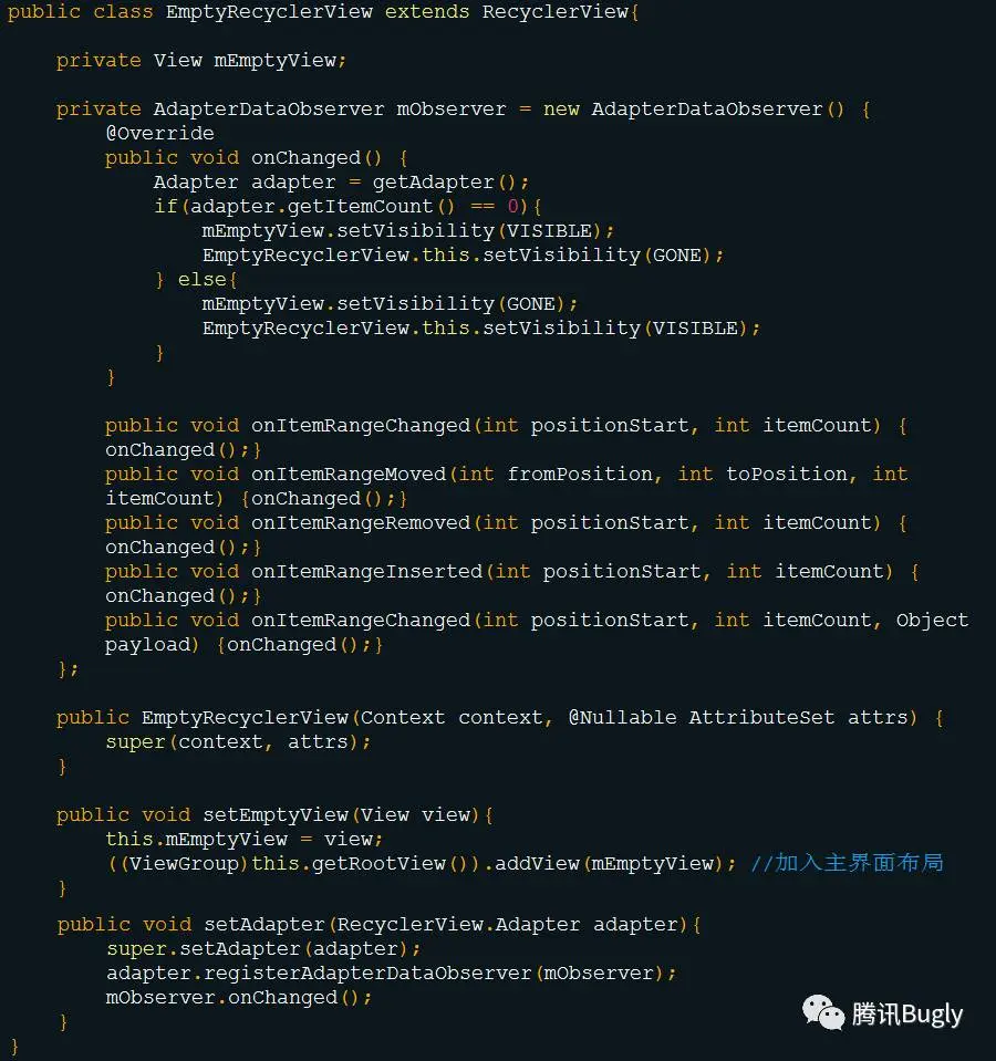 通过AdapterDataObserver监听RecyclerView的数据变化,如果adapter为空,那么隐藏RecyclerView,显示EmptyView。