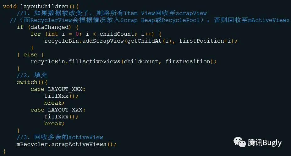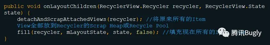 接下来我们通过源码分析ListView是如何与RecycleBin交互的。其实ListView和RecyclerView的layout过程大同小异,ListView的布局函数是 layoutChildren(),实现如下: