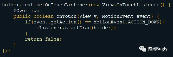 如果要对ViewHolder的text对象支持触摸拖拽,则在Adapter中的 onBindViewHolder()中添加: