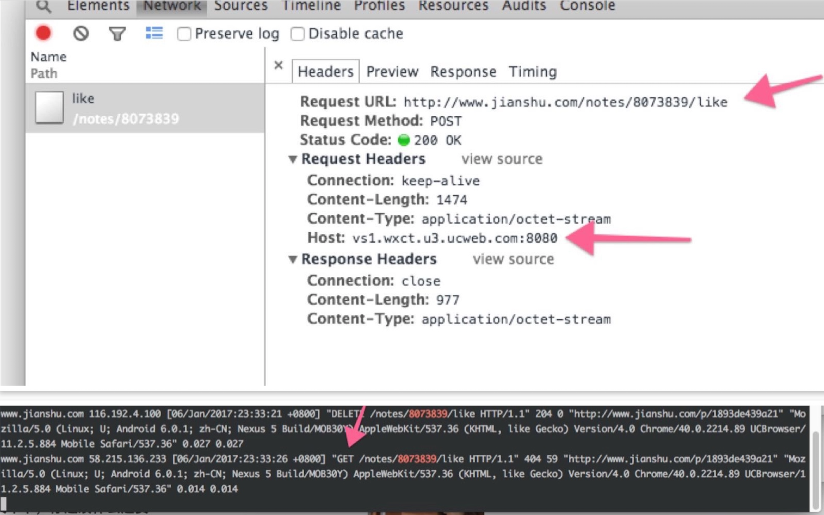 挠头一阵之后,发现 UC 是把所有 body 为空的 POST 请求全部改为 GET,所以在所有空 POST 请求中都加一个其实无用的参数 { f: 1 },就可以防止 UC 把这个 POST 请求。