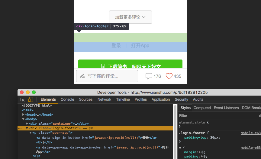 简书移动页面底部有一个 <div class="footer"> 元素,里面是 登录 和 打开 App 两个按钮,如下图: