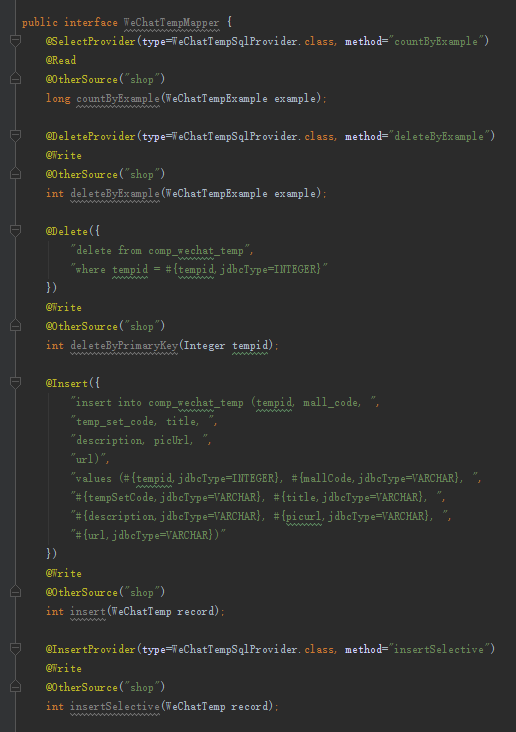 <property name="dataSource" value="shop"/>@Overridepublic boolean clientGenerated(Interface interfaze, TopLevelClass topLevelClass, IntrospectedTable introspectedTable) {
