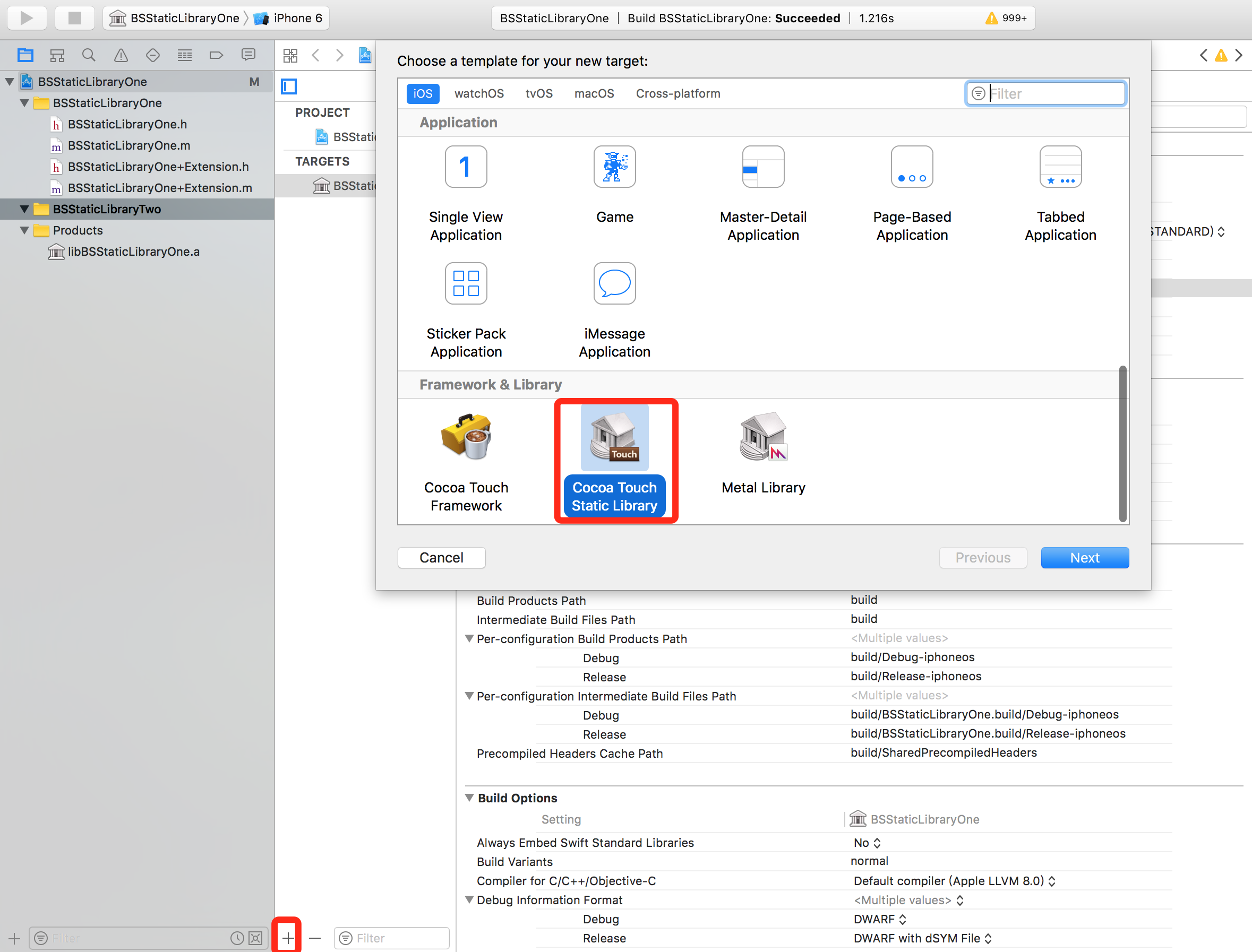 - ShellProject (壳工程)首先要新建一个文件夹 BSStaticLibraryTwo 并拖入到项目中,然后新增一个 Target(如下图所示)。