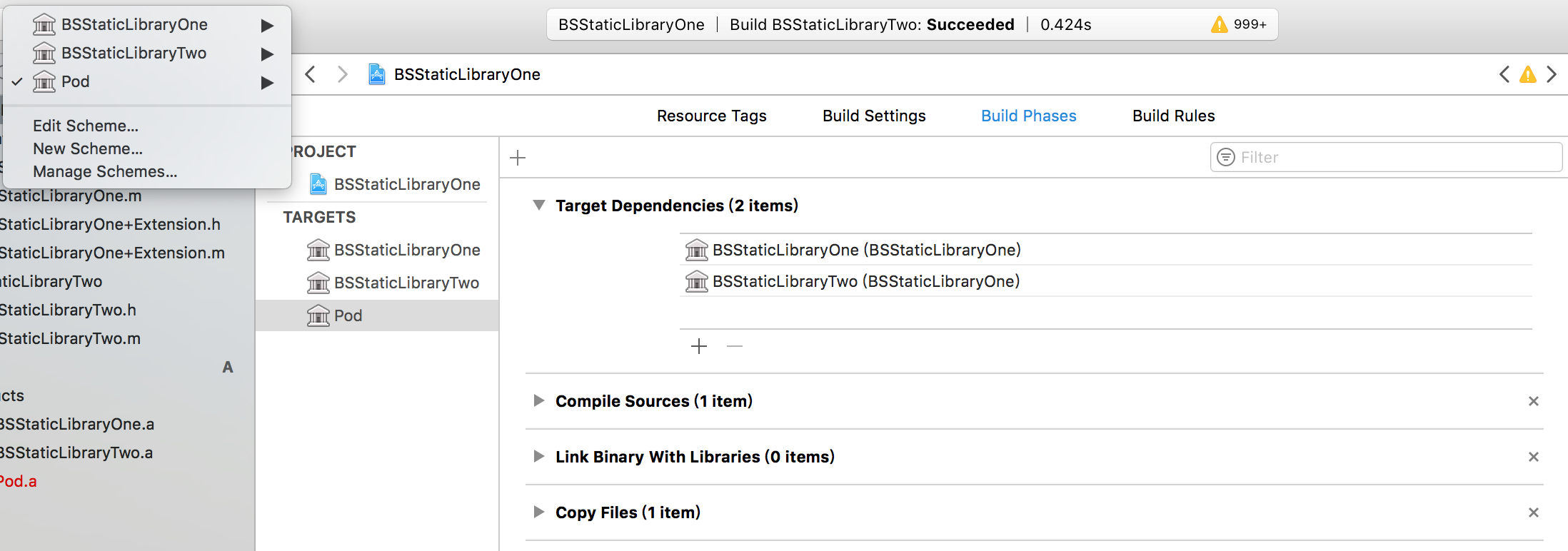 做好上述改动后,即使我们删除掉 BSStaticLibraryOne 这个项目的编译结果,只在 Workspace 中编译主项目,Xcode 也会自动为我们编译被依赖的静态库。这就是为什么我们只需要执行 pod install 下载好代码,就可以不用做别的操作,直接在主项目中运行。