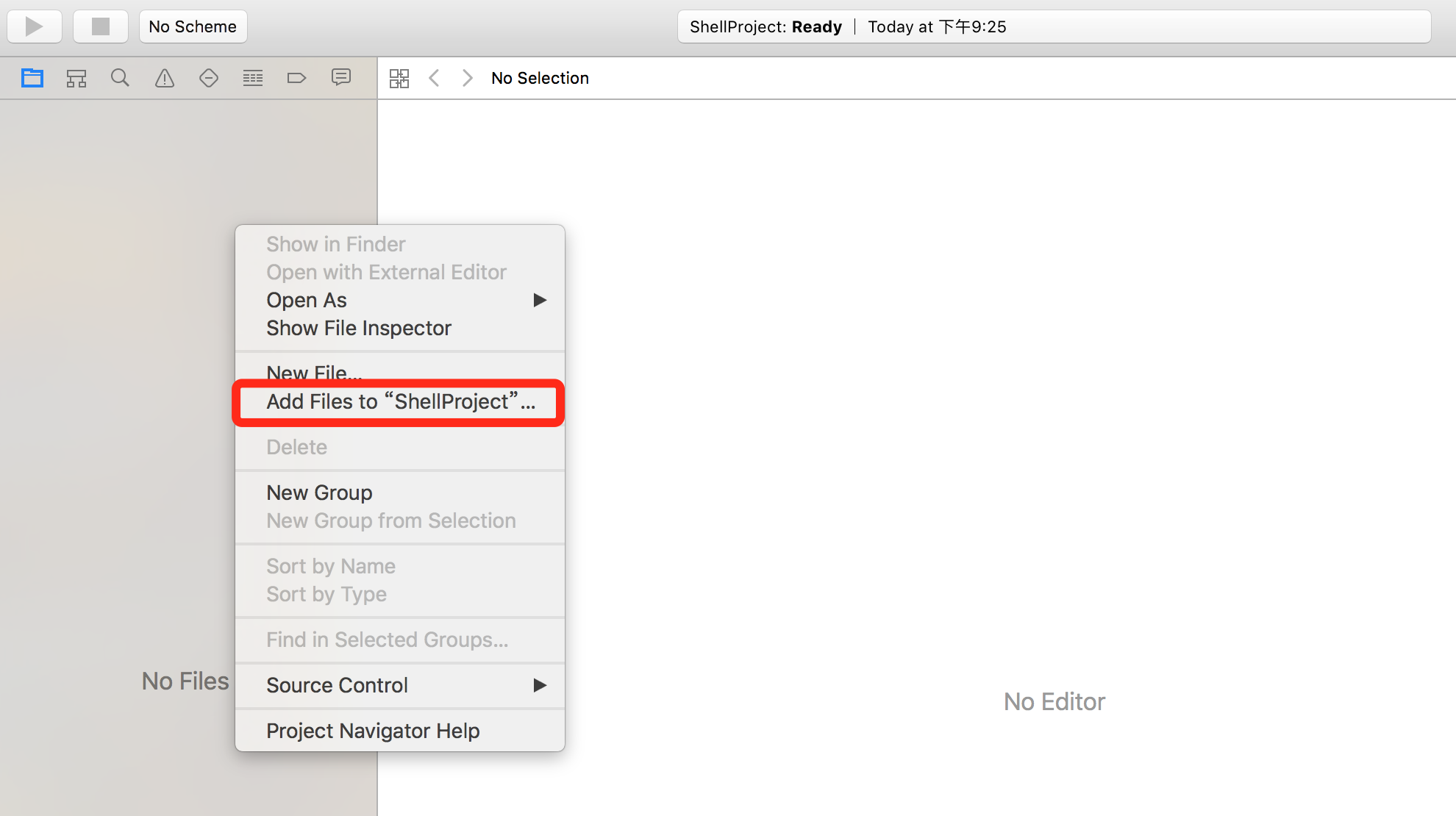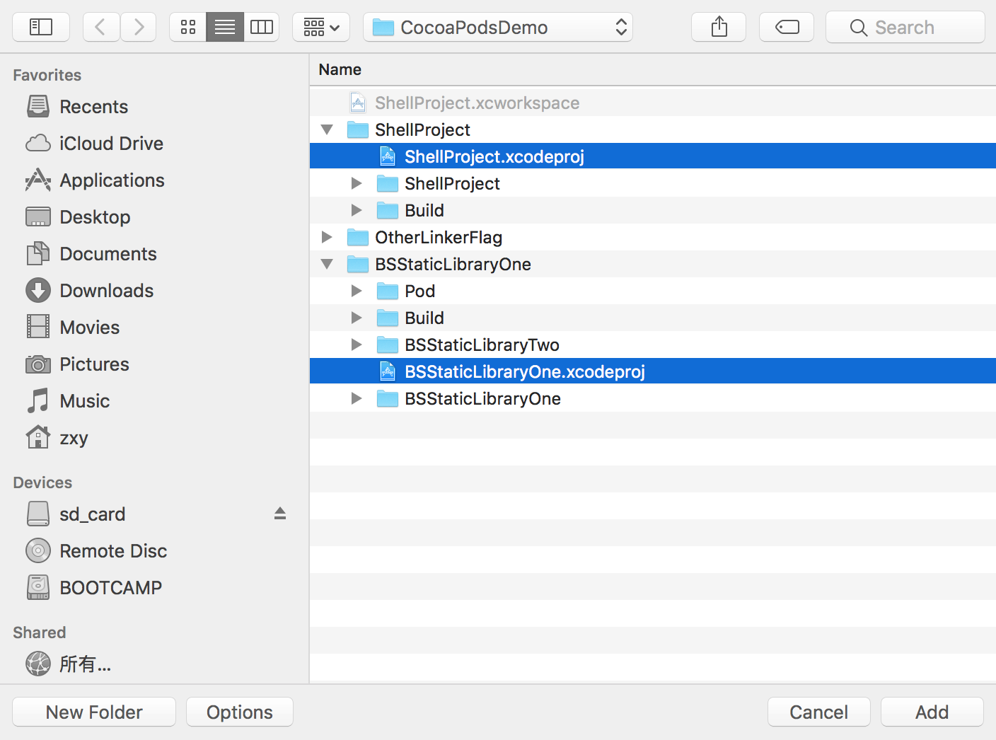 假设之前的 BSStaticLibraryOne 工程就是下载好的源码,现在我们要做的就是把它集成到一个已有的工程,比如叫 ShellProject 中。