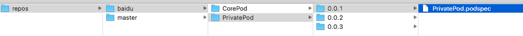 如图中所示,master 是官方仓库,而 baidu 则是我用来测试的私有仓库。仓库中会存有所有 Pod 的信息,每个文件夹下都按照版本号做了区分,每个版本对应一个 podspec 文件。从图中可以看到,cocoapods 会缓存所有的 podspec 到本地,但不会缓存每个 Pod 的具体代码。每当我们执行 pod install 时,都会先从本地查找 podspec 缓存是否存在,如果不存在则会去中央仓库下载。