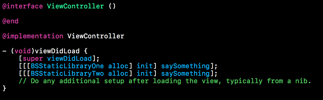 接下来我们重复之前的步骤,设置好头文件和静态库的搜索路径,并在 Other Linker Flags 里面添加: -l"BSStaticLibraryTwo",就可以使用第二个静态库了。