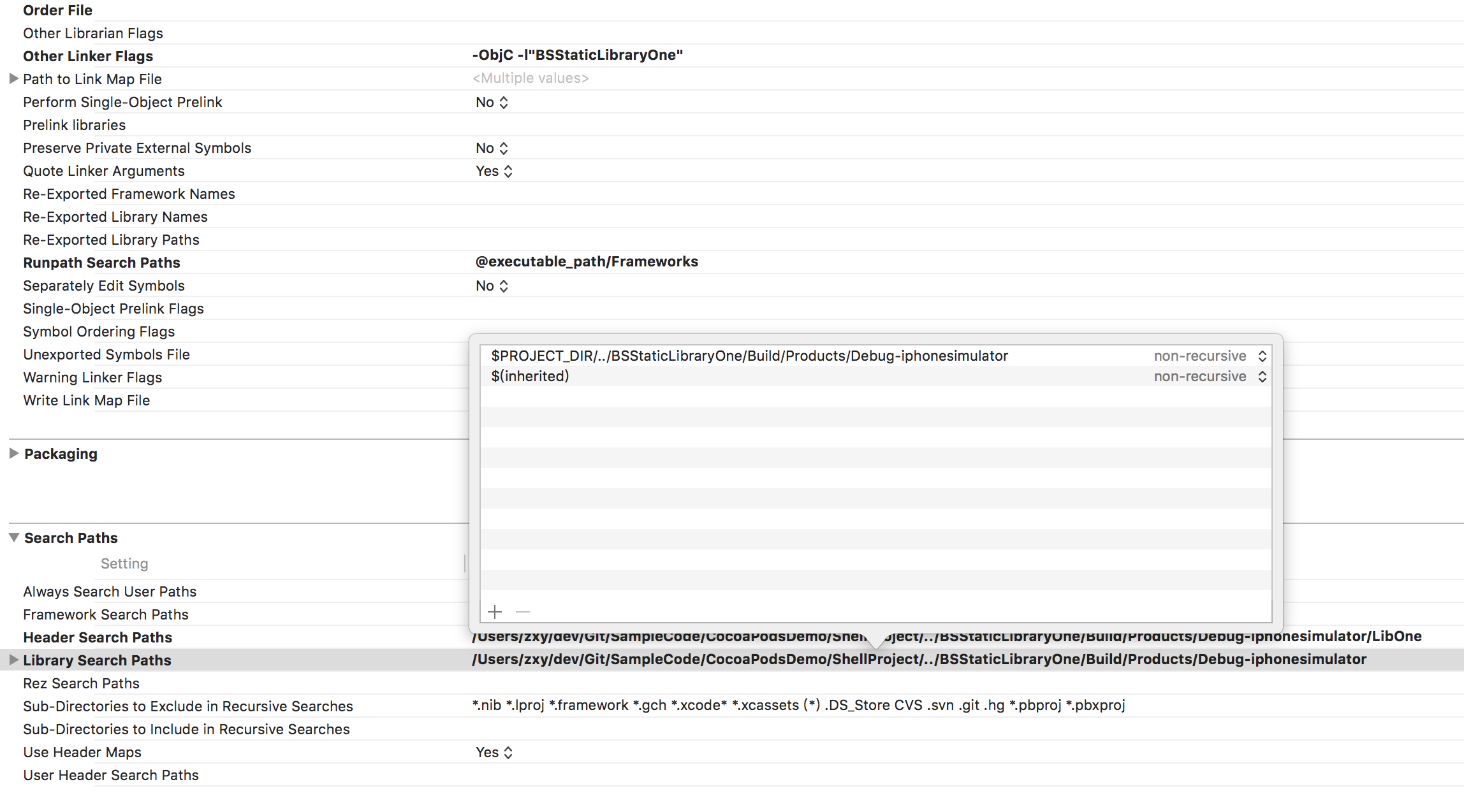 - ShellProject (壳工程)因此我们要做的是让壳工程的 Library Search Path 指向 CocoaPodsDemo/BSStaticLibraryOne/Build/Products/Debug-iphonesimulator 这个目录: