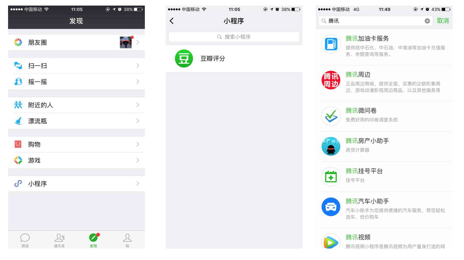 退出豆瓣评分小程序后,进入微信底部的“发现”,就会看到底部多出小程序的入口了,点击进去,即可看到我们刚才用过的小程序—— “豆瓣评分” ,以及搜索框,这时候在搜索框内输入你想体验的小程序名字,就可以进入对应的小程序了。