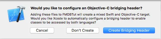 在项目中集成 FMDB 库最常用的方法是用 CocoaPods 进行安装,具体的步骤请参考这里。然而,尤其是对 Swift 项目来说,下载库的 zip 文件,然后把特定的文件添加到项目中的方式更加快捷。你会被要求添加一个桥接头文件,因为 FMDB 库是用 Objective-C 编写的,桥接文件是两种语言一起工作所必需的。