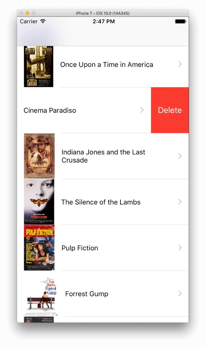 以上代码将启用红色删除按钮,当我们从右到左滑动单元格式时,按钮会出现。通过调用 deleteMovie(_:) 方法完成 if 语句的功能,如果方法执行成功,将从 movies 数组中删除匹配的 MovieInfo 对象。最后,重新加载 tableview,使对应的电影单元格消失: