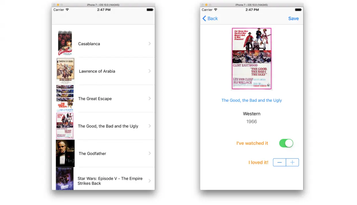 在这个教程中,我们的示例应用将显示一个电影列表,电影的详细信息可以在一个新的视图控制器中展示(是的,我知道,之前使用过电影作样本数据,但是 IMDB 的数据资源的质量实在是太高了)。除了详细信息,我们还可以将电影标记为 已观看,并标注 喜欢 的程度(范围从 0 到 3)。