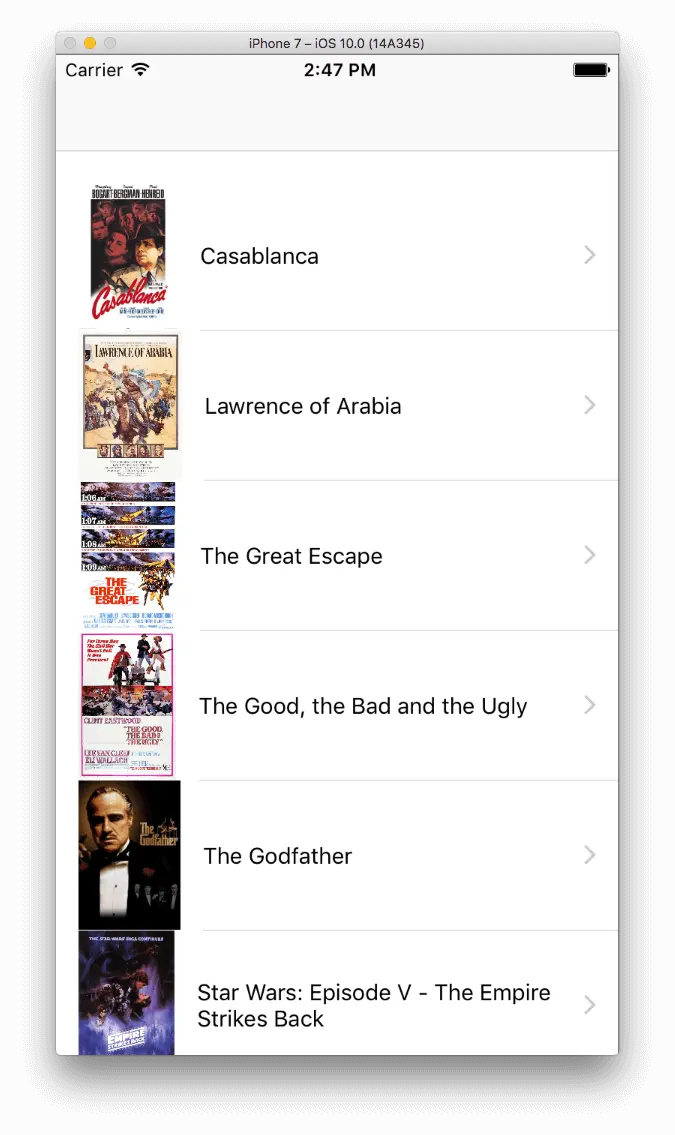 无论如何,现在你第一次可以运行应用程序了。 首次启动时将创建数据库,并将初始数据插入其中。接下来,数据将被加载,电影将显示在 tableview 上,就像下面的截图所示: