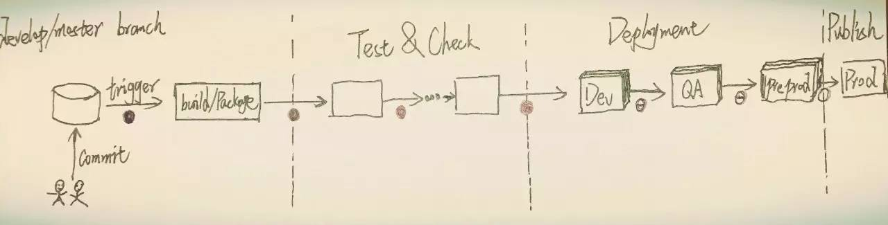 而我曾经接触过的一些项目,同样为了便于说明,这里我们统称它为B项目,不管它的CI/CD工具用的是Jenkins还是go.cd,它们都会是一种流水线(Pipeline)的形式,如下图所示(没错,请叫我灵魂画师,<手动羞耻脸>):