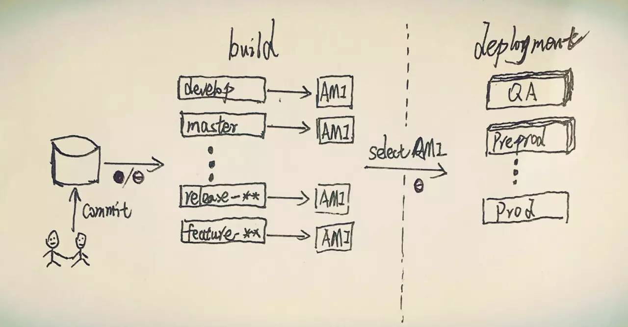 以分支和环境为中心,这种策略在构建时以分支(branch) 来区分构建的产物,如果你的工作模式是在各个不同的分支上开发且测试的话,你可以基于分支的相互独立的进行对应的部署和测试。举个栗子,如果你基于feature1分支构建生成了一个AMI镜像,然后你基于该镜像部署它到qa-1环境中,然后同样的将feature2分支部署到qa-2环境中,然后测试人员就可以同时在两个环境测试不同的功能。