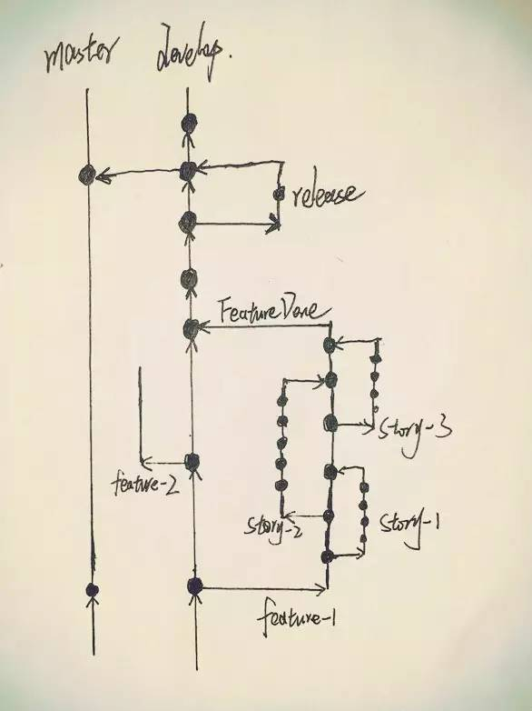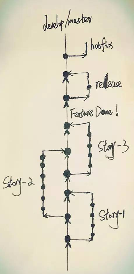 这种模型的话,理论上来说相对安全。但是一般Feature分支都是需要用于开发一个较大的功能才做的分支,在此之上,我们还要建对应的故事卡(敏捷中,一个不可/不宜划分的需求单位)的分支,如下所示: