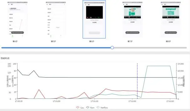 上图是用Xtest进行多机联测后一台设备的性能数据展示。从截图可以看到当进入小程序的视频界面开始播放后(第6步),曲线图的红色线(CPU)开始斜坡上升,随着视频加载缓存(第7、8步),代表上下行流量的绿色线(NetFlow)开始陡增。嗯,还是比较符合人类宏观认知理论的。如果配合脚本的场景编写,应该很容易就可以完成压测中的性能数据收集,并根据图片手顺定位哪步操作会导致性能数据异常。