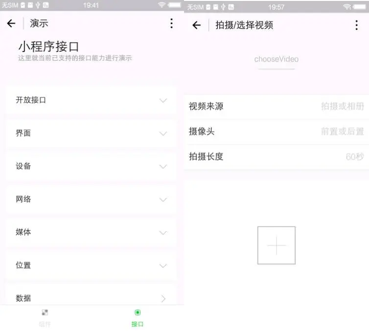小程序演示中除了提供组件之外也展示了部分接口功能,从中抽取代表性的“选择视频”这一较为复杂用例进行测试:(接口类型:媒体--视频)