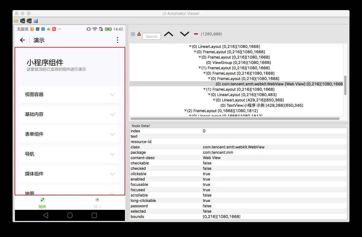 UIAutomator是为数不多的Android官方支持的自动化测试框架之一,最早发布的版本为API Level17。作为基于控件的自动化框架,UIAutomator确实接口明晰容易上手,基于UIAutomator也发展出了鼎鼎大名的Appium开源自动化框架,业界地位大有舍我其谁之势。然而使用UIAutomator的前提是可以用UIAutomatorViewer查看到我们预操作控件的属性信息,上面分析我们已经看到,小程序部分控件的父容器是weview,此webview还非标准结构,应该是腾讯自研的X5内核。想用appium UIAutomator跑自动化的念头自此打消了。