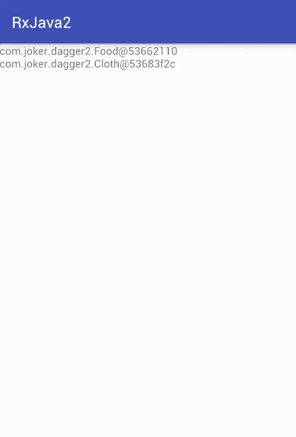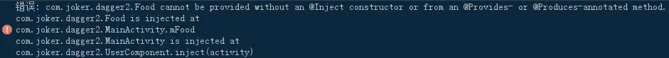 没有任何问题,我们成功的将 Cloth 对象注入了进来。那要是我们想要注入 User 对象呢,直接修改 @Inject 后面的注入对象,改成 Food 对象不就行了么!我们将[3]处的代码改成Food mFood;,将[4]处的代码改成mContentTextView.setText(mFood.toString());