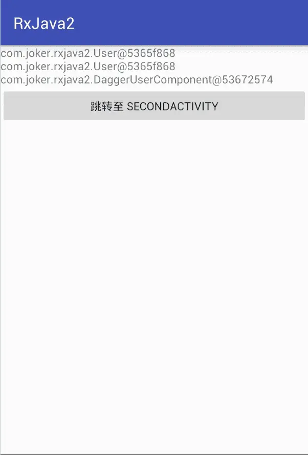 可以的,可以看到,单例实现成功了,我们仅仅通过一个 @Singleton 标记就使得对象实现了单例模式,接下来我们点一下按钮跳转到 SecondActivity 中,如图所示: