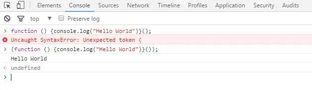 有一点需要注意的是,函数表达式function(j){/code/}(i)和函数声明是不一样的,如果在以为函数声明时,在函数后面加上()这个括号,就是直接调用函数,是会出错的,因为编译器认为这个是函数声明,而不是函数表达式。但是如果用一个括号,将整个函数声明包起来,编译器会认为是一个表达式,就不会报错,如下面所示: