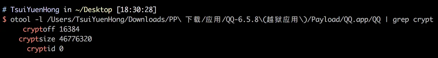 otool -l /Users/TsuiYuenHong/Downloads/PP\\\\ 下载/应用/QQ-6.5.8\\\\(越狱应用\\\\)/Payload/QQ.app/QQ | grep crypt