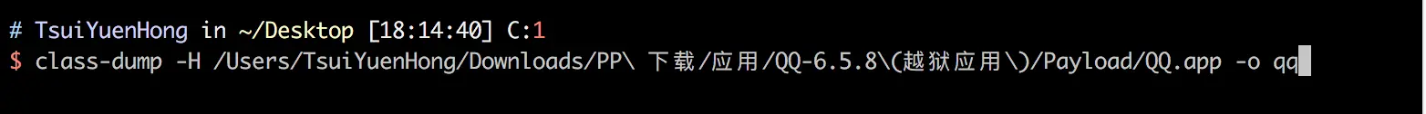 class-dump -H /Users/TsuiYuenHong/Downloads/PP\\\\ 下载/应用/QQ-6.5.8\\\\(越狱应用\\\\)/Payload/QQ.app -o qq