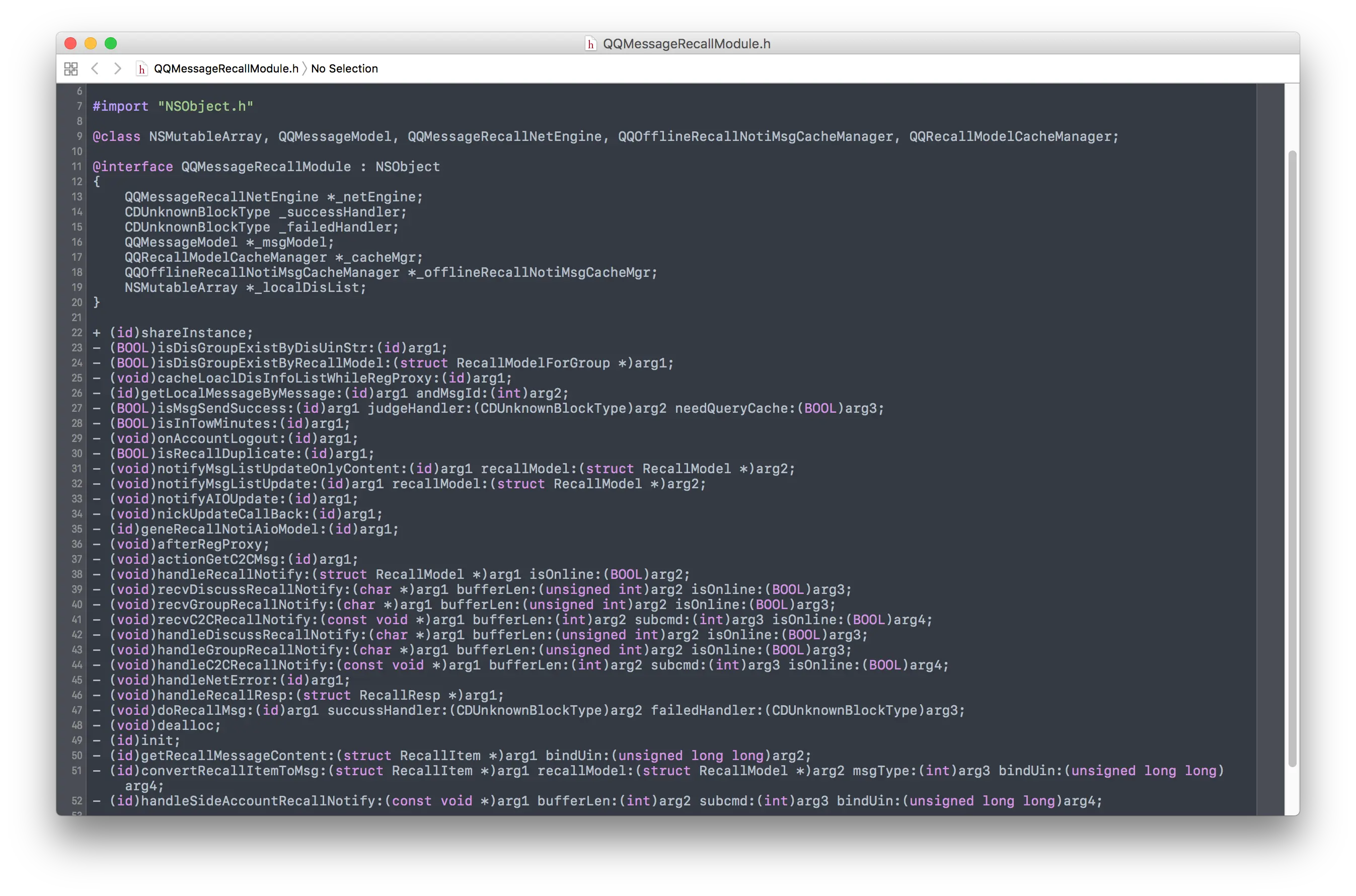 在头文件中发现一个叫 QQMessageRecallModule 的类,这翻译过来不就是 QQ信息撤回模块 吗?