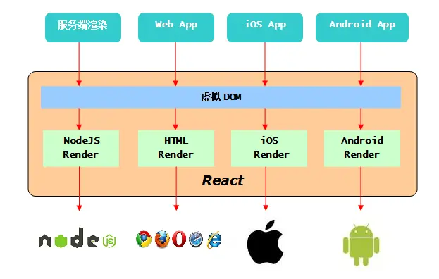 因为有了虚拟DOM这一层,所以通过配备不同的渲染器,就可以将虚拟DOM的内容 渲染到不同的平台。而应用开发者,使用JavaScript就可以通吃各个平台了。相当棒的思路!