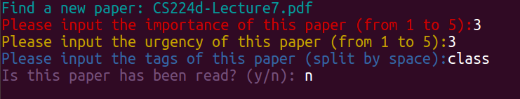 按照提示录入即可,分别是重要性(importance),紧急性(urgency),都是1-5的整数,还有所有tag(用空格隔开),以及这篇论文是不是读过了。