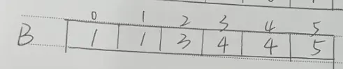 - 累加B数组,获得元素的排位,从0开始遍历B, B[i+1]=B[i]+B[i-1]