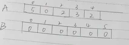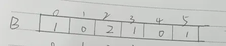 上图B数组中表示A中0有一个,1有0个,2有两个,3有一个,4有零个,5有一个。