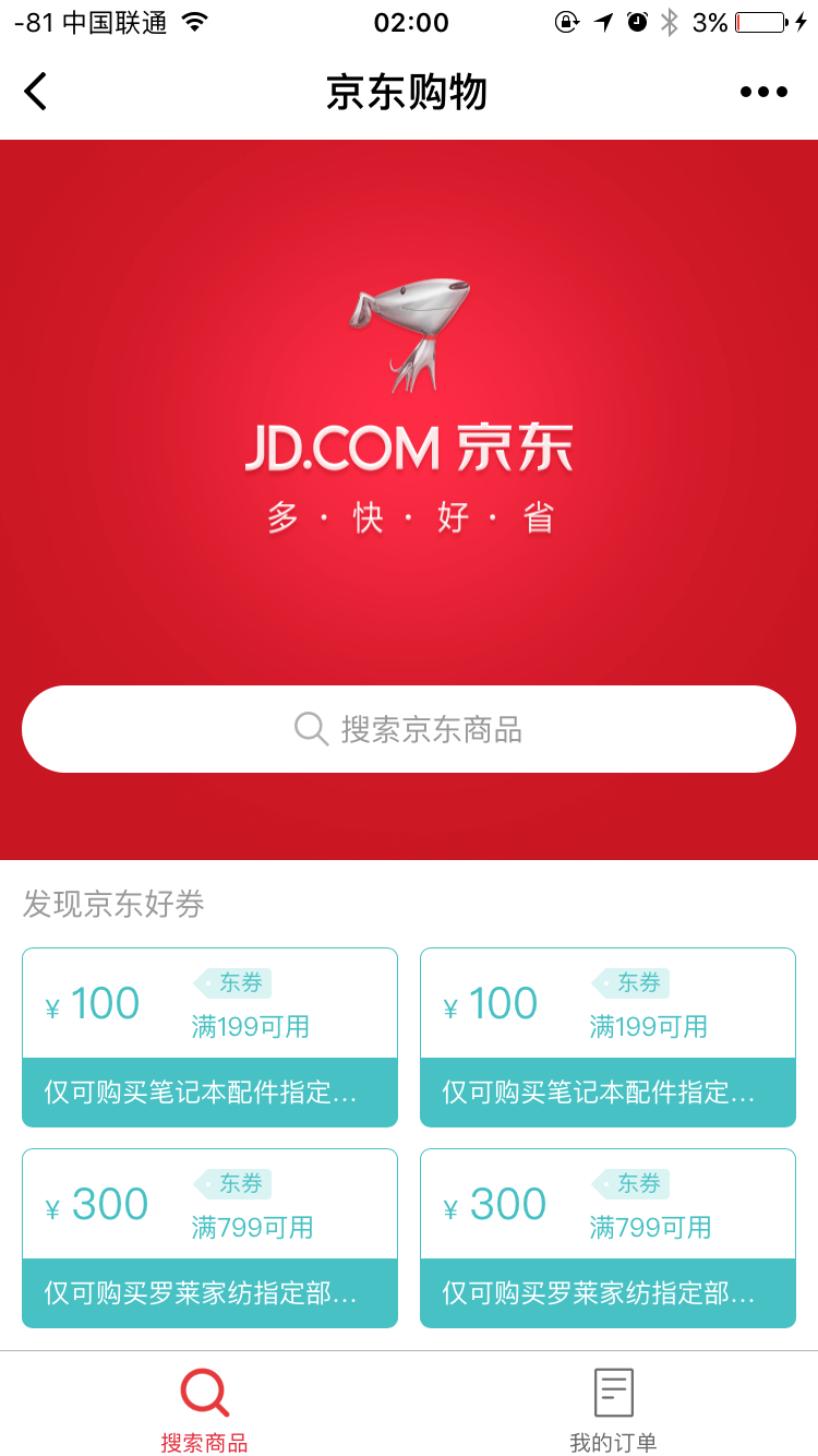 用户的高频使用场景是购物和查看订单。小程序首页默认显示第一个按钮下的内容,只提供了一个非常简易的搜索按钮和一些优惠券;第二个按钮我的订单可以查询相关订单信息。这两个功能恰好满足了用户最核心的使用场景,是非常符合小程序的设计思路的。也就意味着“京东的小程序”更适合那些带有相对明确目标的用户来快速完成一次购物流程,而不适合那些想来“京东上”闲逛的用户。