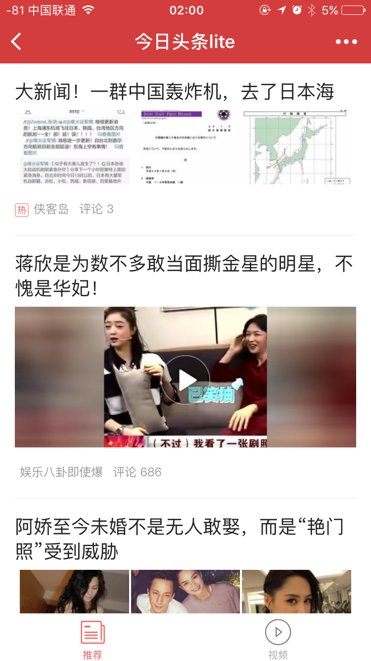今日头条以算法推荐闻名。目前的小程序没有登录环节,这意味着提供的内容并不精准。首页只有两个按钮,一个推荐一个视频,没有提供分类,相比较其它的小程序还缺失了那么一点点灵性。如果今日头条能够接入个人数据,或者是在小程序内根据用户的阅读数据不断优化算法,和App内的推荐菜单下展示精准的用户感兴趣的内容,我觉得会是非常不错的小程序。(我甚至觉得连“视频”都可以不要,只有推荐一栏,不过短视频的确是资讯类产品的一个重要的攻略方向,所以才会有这个按钮吧)